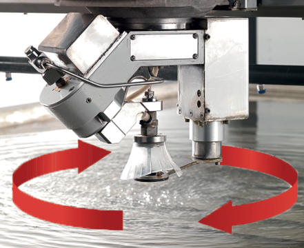Intermac Primus – Water jet cutting In-depth knowledge of the requirements of the glass and stone cutting optimization process has lead Intermac to design a machine that is easy to sue, with limited maintenance needs and high productivity levels, capable of satisfying the most intricate applications, both in terms of flexibility and performance. Maximum programming flexibility The five-axis cutting head equipped with the (patented) C-axis with infinite rotation supports the machining of angled cutting profiles (+/-60°) coupled with the highest quality.